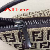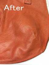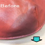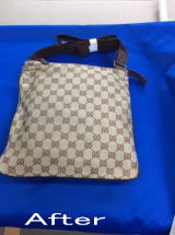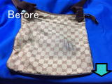 ラーメン屋さんの机の下にバッグを置いたらこんなことになってしまいました。油のシミを取って全体的にクリーニングをしました。どこにシミがあったのかわからないほどきれいに落とせました。