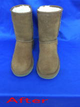 水たまりに入ってしまって茶色くシミになってしまいました。出来るだけシミが薄くなるように除去しましたが、完全には落ちませんでした。お客様とご相談してシミよりも濃い色に染め替えました。
