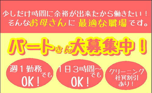 この度、パートさんを募集する理由は、スタッフみんなが気兼ねなくお母さん、おばあちゃん、娘、妻、素敵な女性で居て